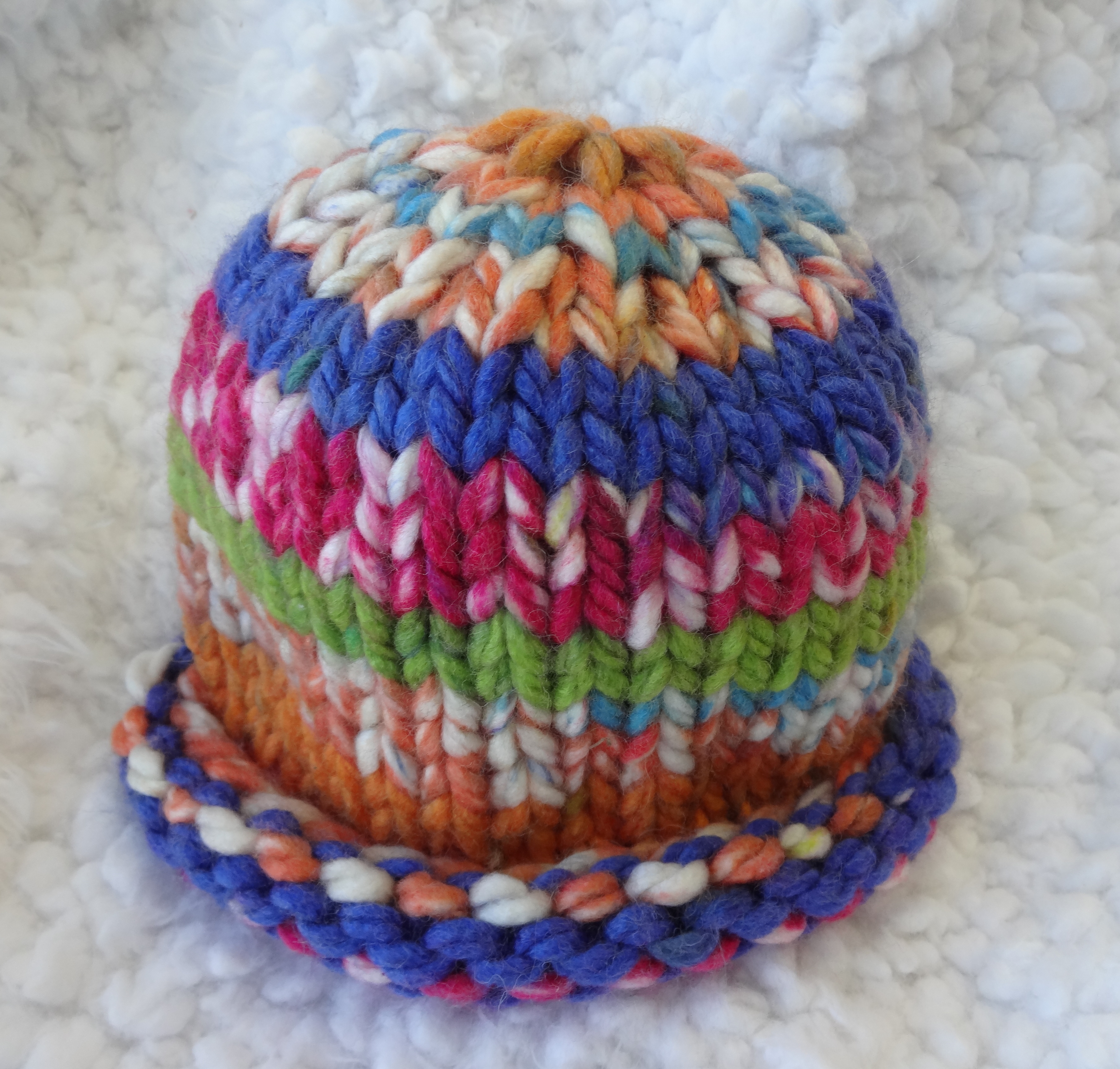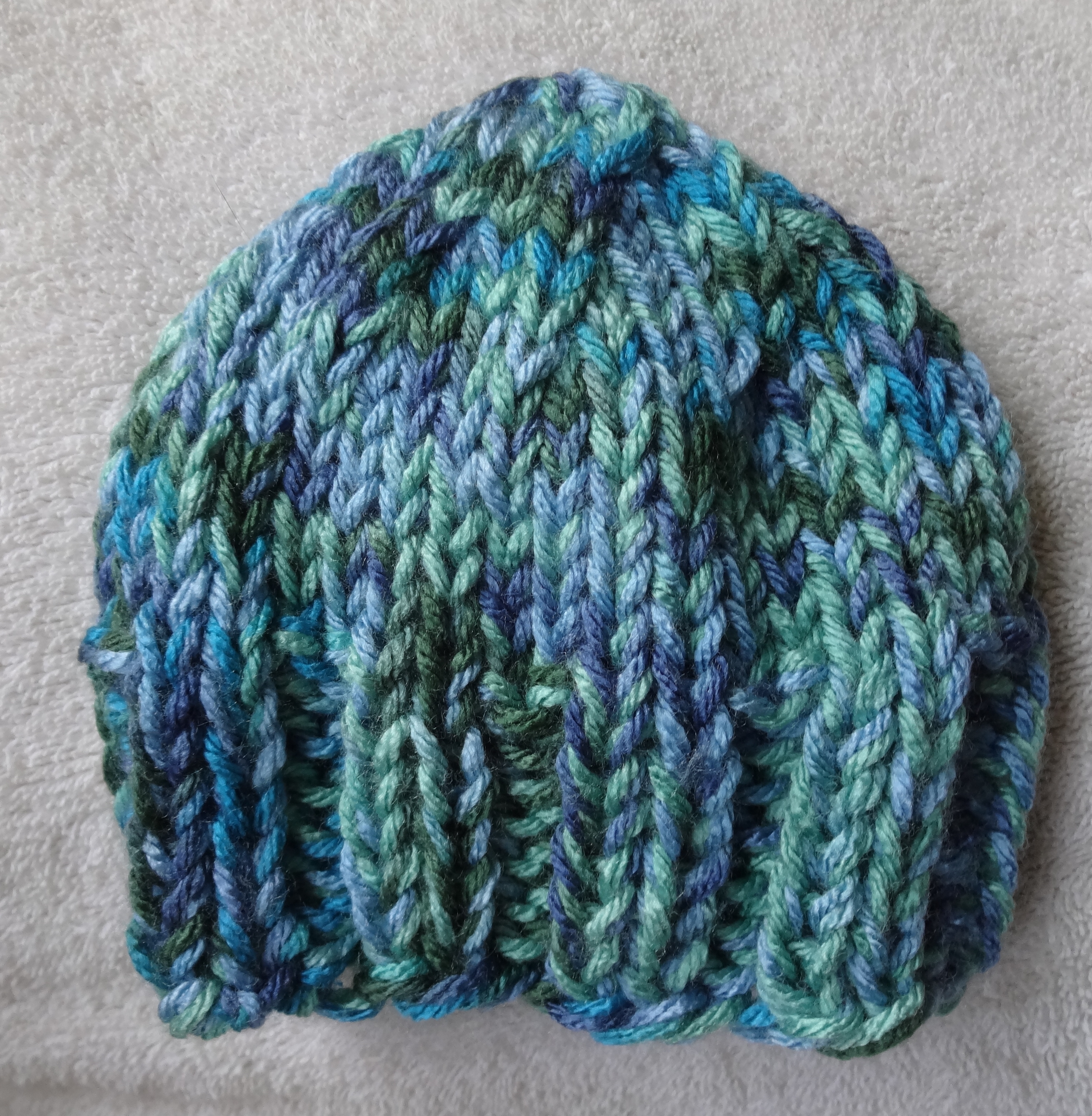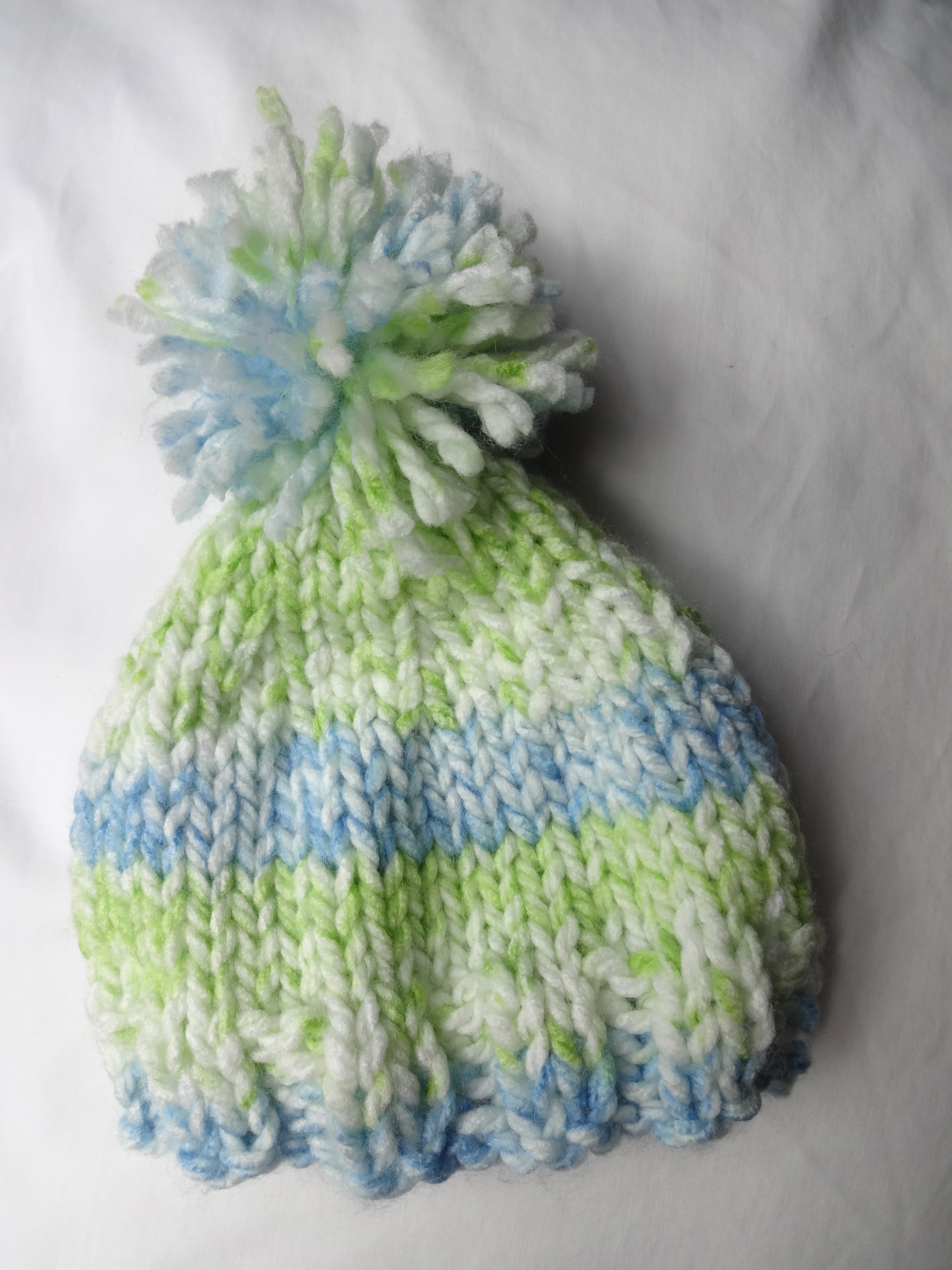 So, as you can imagine – these changes have brought around a lot more in our household.  We haven’t left the house as a family for more than a couple of hours – unless we’ve taken the dog to day care.  Yes, Day Care for the dog – Crazy idea when I first heard of it, Genius idea now that I have a dog.   My husband does even more of the laundry and grocery shopping, now that I’m working 10 hours some days.   My daughter is driving Me around.  And knitting, sadly, has been put aside.   So, here is a little boy hat I made months ago, that I just found and realized I never posted.