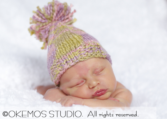 Well, that’s what I was thinking of the aqua colored hat right here.   This is actually the 3rd hat I made- in a row – trying to get the shape and size just right.  I try to come up with all of my own patterns, so it’s often trial and error before I get it right.   And when I finally got it – woo hoo!  I had to put down the needles for a couple of days to let my elbow and wrist recover.   I loved the idea of huge poms on the sides – I think it will be so cute for everyday – as well as professional portraits.   I’ve name it “Starr” – after my older sister – I don’t know why I picked this particular hat for the name.  It just makes me happy, and made me think of her.