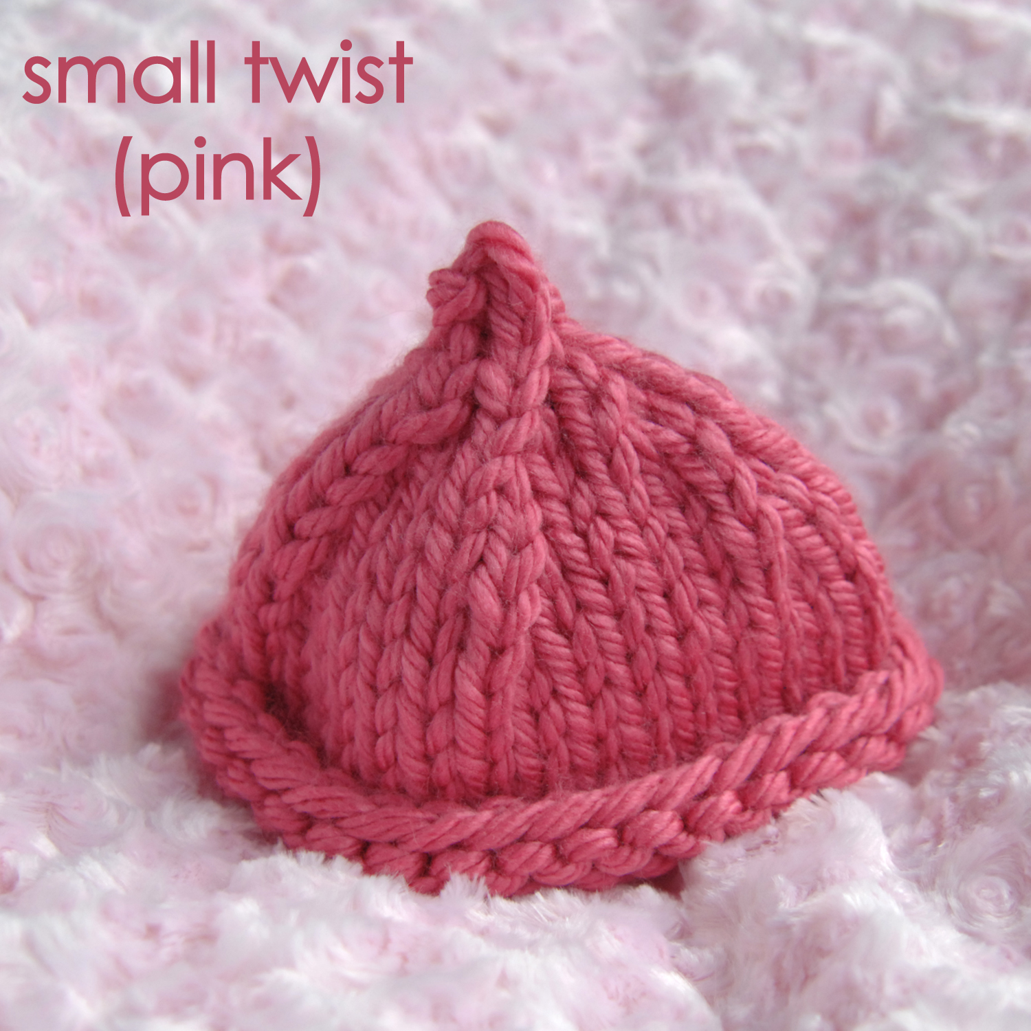 After determining my patterns for the named hats below, I decided to play around a bit with other styles and designs. This is called, descriptively enough, Small Twist (pink). Made of the same chunky yarn as the Brooke, this is